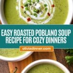 This Roasted Poblano Soup is a flavorful and mildly spicy Mexican-inspired soup made with roasted poblano peppers, onions, garlic, and rich stock. The soup is thickened with a butter and flour roux, blended smooth for a velvety texture, and garnished with Mexican crema, cilantro stems, and hot sauce to add brightness and depth. Perfect for a warming meal that highlights the smoky, earthy notes of roasted poblanos.