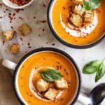This Roasted Red Pepper Cauliflower Soup is a creamy, cozy, and deliciously flavorful vegan soup made with roasted garlic, grape tomatoes, cauliflower, carrots, shallot, and red bell peppers. Blended with full-fat coconut milk for richness and finished with optional garnishes like croutons, parmesan, and crushed red pepper, it’s a comforting and nutritious dish perfect for any season.