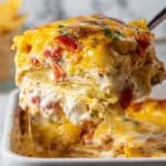 - Ripping tortillas to fit inside the dish ensures even layering and coverage.