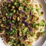 - Serve: Plate the pasta and top with the olive mixture, crispy toasted breadcrumbs, and a final sprinkling of parmesan cheese.