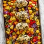 This Sheet Pan Chicken and Veggies recipe offers a simple, delicious, and healthy one-pan meal. Juicy boneless skinless chicken breasts are seasoned with Italian spices and roasted alongside colorful bell peppers, potatoes, and red onions. The meal is seasoned to perfection with garlic, olive oil, salt, and pepper, making cleanup a breeze while providing a satisfying dinner option ideal for busy weeknights.