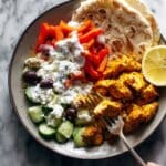 - Assemble and Serve: Arrange the roasted chicken, peppers, tzatziki sauce, diced cucumber, diced red onion, kalamata olives, and feta cheese on a large platter or sheet pan. Serve with your choice of flatbread to let everyone build their own pitas, bowls, or salads.