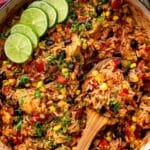 Southwest Chicken and Rice is a flavorful, one-pot meal featuring tender diced chicken breast cooked with fajita spices, sautéed peppers and onions, fire-roasted tomatoes, black beans, and seasoned rice. Finished with melted Mexican cheese, fresh cilantro, lime juice, and sweet corn, this dish offers a perfect balance of spice and creaminess for a cozy and satisfying dinner.
