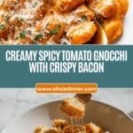 A rich and comforting Spicy Tomato Gnocchi with crispy bacon, sautéed onions, and a creamy tomato sauce infused with white wine and Italian seasonings. This easy one-pan dish is perfect for a quick weeknight dinner, garnished with fresh basil and parmesan cheese for added flavor.