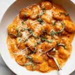 A rich and comforting Spicy Tomato Gnocchi with crispy bacon, sautéed onions, and a creamy tomato sauce infused with white wine and Italian seasonings. This easy one-pan dish is perfect for a quick weeknight dinner, garnished with fresh basil and parmesan cheese for added flavor.