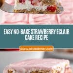 No baking required at all! This Strawberries and Cream Eclair Cake Recipe relies on layering and chilling to develop its textures and flavors, making it a quick and easy dessert to whip up any time.