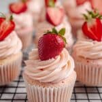 - Frost cupcakes and garnish: Fill a piping bag fitted with a large star tip with the prepared buttercream. Pipe the frosting generously onto the cooled cupcakes. Top each cupcake with a halved fresh strawberry for garnish.