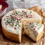 - Decorate and Serve: Remove sides of springform pan. Transfer cheesecake to serving plate or cake stand. Spread frosting evenly over top and decorate with assorted Christmas sprinkles if desired. Serve immediately or keep chilled in refrigerator until ready to serve.