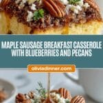 - Assemble the Casserole: In the greased baking dish, spread half of the cubed bread evenly. Pour half of the egg mixture over the bread, then layer half of the cooked sausage, half of the shredded cheddar cheese, and half of the maple syrup. If using, sprinkle half of the fresh blueberries and chopped pecans over the top. Repeat this layering with the remaining ingredients to create a second layer.