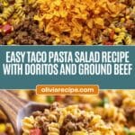 Leftover taco pasta salad keeps well in an airtight container in the fridge for up to 3 days. To help maintain the best texture, keep the Doritos separate and add them right before serving leftovers so they retain their crunchiness.