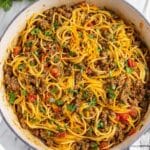 This Taco Spaghetti recipe is a delicious fusion of classic taco flavors with comforting spaghetti, cooked all in one pan for a quick and easy weeknight meal. Ground beef is seasoned with taco spices, simmered with tomatoes and spaghetti noodles, then topped with melty cheddar cheese and fresh cilantro for a flavorful and satisfying dish that the whole family will love.
