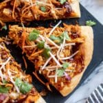 This Thai Chicken Pizza recipe combines classic pizza with vibrant Thai flavors, featuring a homemade or store-bought thin pizza crust topped with a rich peanut-hoisin sauce, shredded chicken, mozzarella cheese, and fresh vegetables like bean sprouts, carrots, and cilantro. The pizza is baked to golden perfection and finished with crunchy roasted peanuts for added texture, delivering a unique fusion dish perfect for a flavorful meal.