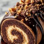 This decadent Chocolate Peanut Butter Roll Cake features a light and fluffy cocoa sponge rolled with a creamy peanut butter filling studded with chopped peanut butter cups. Topped with a smooth ganache, it’s a perfect dessert for chocolate and peanut butter lovers looking for an indulgent yet easy-to-make treat.