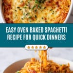 - Serve: Remove from the oven and let it cool for a few minutes before serving. Enjoy your cheesy, flavorful oven baked spaghetti!