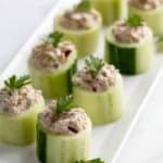 - Fill the Cucumber Cups: Spoon the prepared tuna mixture evenly into each cucumber cup, gently mounding the filling on top so each cup is generously filled.