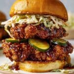 - Assemble the Sandwiches: On the bottom half of each toasted buttered brioche bun, layer a generous amount of kimchi slaw, followed by a glazed Korean fried chicken piece, and then top with quick pickles. Place the top bun over the fillings and serve immediately to enjoy the perfect balance of crispy, spicy, tangy, and crunchy textures.