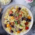 This Warm Italian Pasta Salad is a vibrant and flavorful dish featuring tender farfalle pasta tossed with juicy cherry tomatoes, Kalamata olives, fresh herbs, and a tangy balsamic dressing. Perfectly combined with Parmesan cheese and pepperoncini for a savory kick, this salad is served warm for a comforting and satisfying meal or side dish.