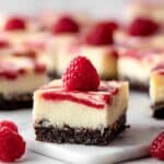 Delight in these luscious White Chocolate Raspberry Cheesecake Bars, featuring a rich Oreo crust, creamy white chocolate cheesecake filling, and a vibrant homemade raspberry swirl. Perfectly balanced between sweet and tart, these bars are a decadent treat ideal for any occasion.