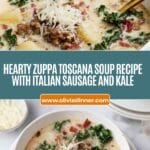 A hearty and comforting Zuppa Toscana soup featuring crispy bacon, Italian sausage, tender russet potatoes, fresh kale, and a creamy broth, simmered to perfection for a rich and flavorful meal.